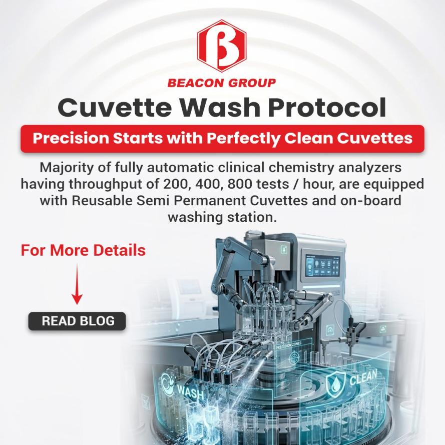 Beacon group of companies are offering range of fully automatic clinical chemistry analyzers having throughput of 200, 400 and 800 tests / hour. These clinical chemistry analyzers are equipped with all above mentioned routine, special and advance wash protocols for reaction cuvettes like DI water wash, special wash, detergent wash, pre-wash, post wash, interference wash as well as carry over evasion to ensure optimum transparency of cuvettes as well as longer cuvette life.